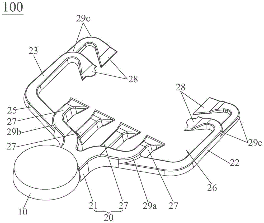 如图1及图2所示,第一直线流道22及第二直线流道23上的辅助浇口28各为两个。具体地,在第一直线流道22中,两辅助浇口28中一者靠近第一倾斜流道24而另一者远离第一倾斜流道24,靠近第一倾斜流道24的辅助浇口28之深度大于远离第一倾斜流道24的辅助浇口28之深度,状见图1及图3所示,这样设计能确保第一倾斜流道24内的熔料能更可靠地顺着第一直线流道22流入第一直线流道22上的各个辅助浇口28处;在第二直线流道23中,两辅助浇口28中一者靠近第二倾斜流道25而另一者远离第二倾斜流道25,靠近第二倾斜流道25的辅助浇口28之深度大于远离第二倾斜流道25的辅助浇口28之深度,状态见图1及图3所示,这样设计能确保第二倾斜流道25内的熔料能更可靠地顺着第二直线流道23流入第二直线流道23上的各个辅助浇口28处。更具体地,第一直线流道22与辅助浇口28之间的交接处及第二直线流道23与辅助浇口28之间的交接处各为弧形的拐弯结构29c,状态见图1及图2所示,这样设计能减少熔料流动阻力。