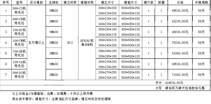 压铸模具报价明细